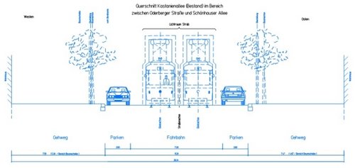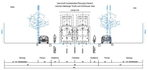 Bild: Querschnitte der Kastanienallee (neu) - In der Planung des Bezirks Pankow wird die Gesamtfahrbahn um 2 m schmaler, die Fahrradfahrer/innen erhalten einen eigenen, separaten Radstreifen und Autos und Straßenbahn fahren im Bereich der Gleise. Dafür müssen für die parkenden Autos Parktaschen angelegt werden. In den Bereichen der Parktaschen rücken die Autos mit einem Rad bis maximal zur Baumachse in den derzeitigen Gehwegbereich. Zwischen den Parktaschen wird der jetzige Gehwegbereich um sogar einen Meter breiter.
